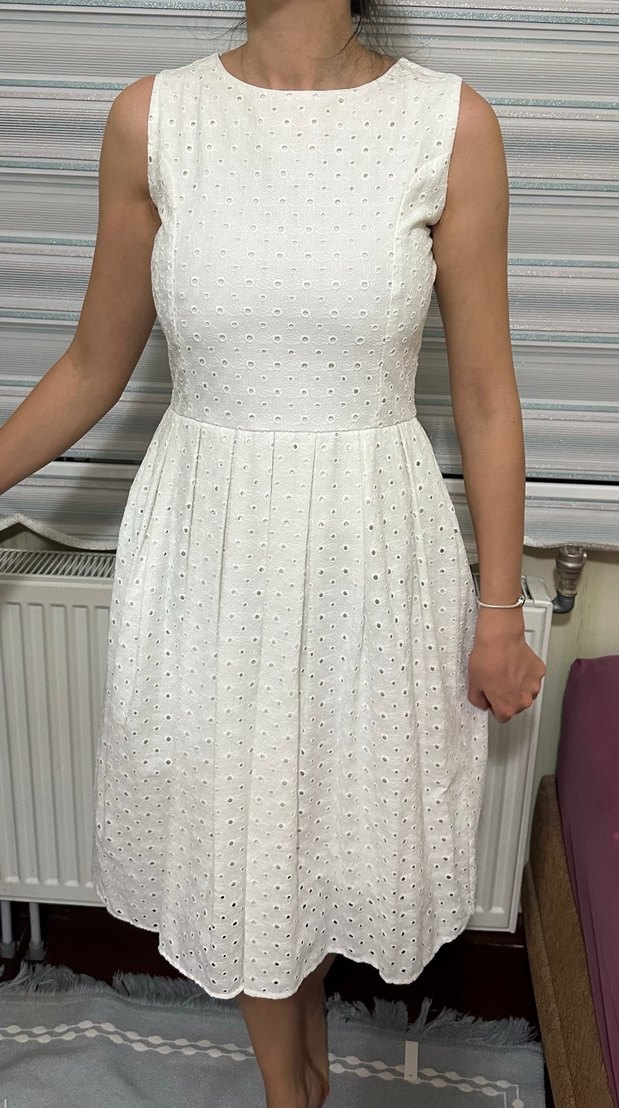 Pamuk kumaştan yapılmış, V yakalı ve kolsuz, dantel detaylı beyaz midi boy dar kesim elbise. Modern klasik tarzda, düğünler için uygun.
