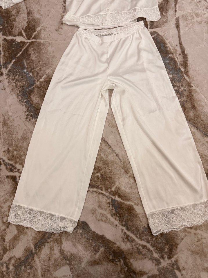 Dantel detaylı, bol kesim beyaz midi pantolon. İpek gibi yumuşak kumaştan, rahat ve bohem tarzlara uygun. Düğünler için ideal.