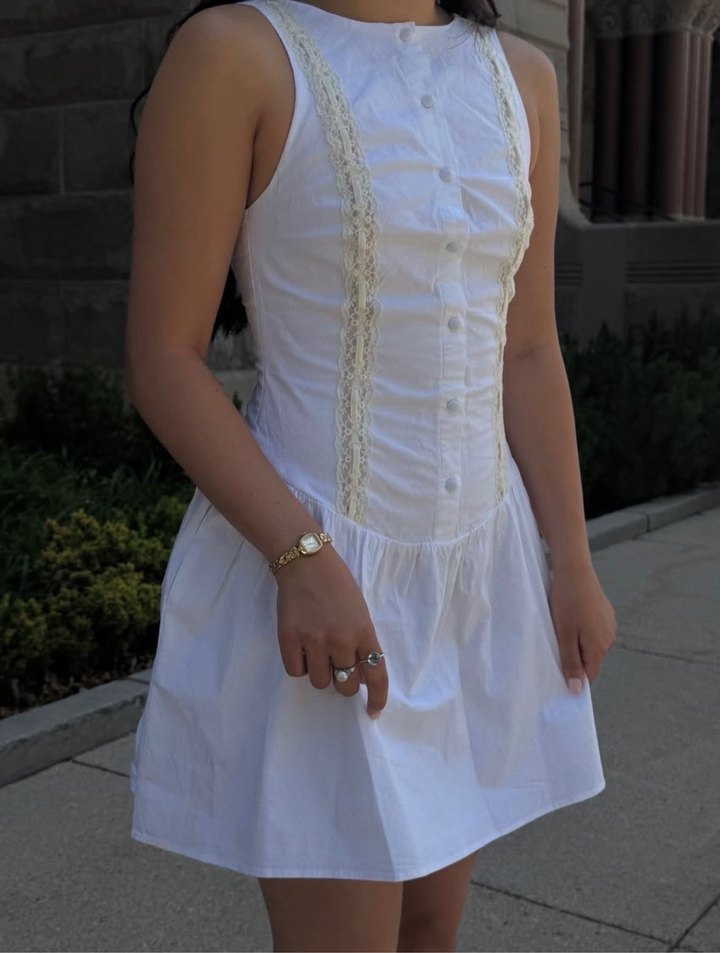 Yumuşak pamuktan, dantel detaylı, kolsuz, yüksek yakalı ve vücuda oturan beyaz midi elbise. Günlük ve düğün için uygun. Ürün orijinal sıfır ve etiketlidir. Arka fermuar yarım açık maalesef bi tutuklul var fermuarda onun dışında hiçbir sıkıntısı yok bu sebeple uyguna koyuyorum