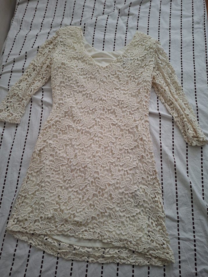Uzun kollu ve V yakalı, triko kumaştan yapılmış, dantel detaylı, vücuda oturan midi boy elbise. Bohem tarzıyla vintage ve retro zevklere uygun, düğünler için ideal.