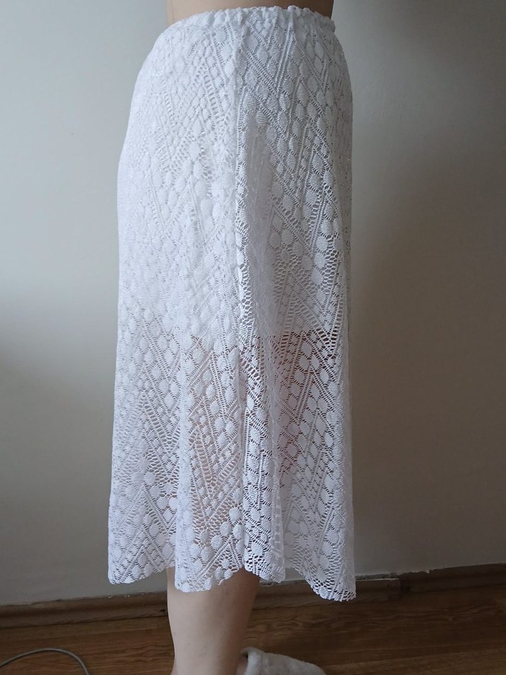 Dantel detaylı, beyaz triko midi etek. Bohem tarzda, normal boyda ve bol kesimdir, günlük kullanım için uygundur.