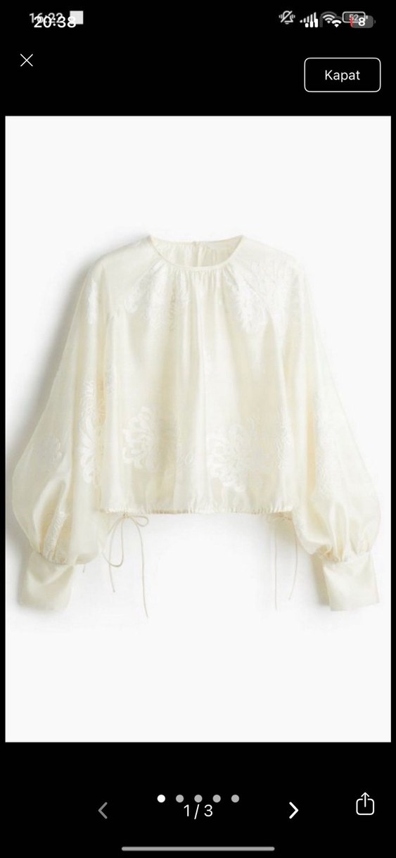 Beyaz renkte, uzun kollu ve bol kesim dantel işlemeli mini bluz. İpek gibi kumaşı ve kısa boyu ile bohem tarzını yansıtıyor.