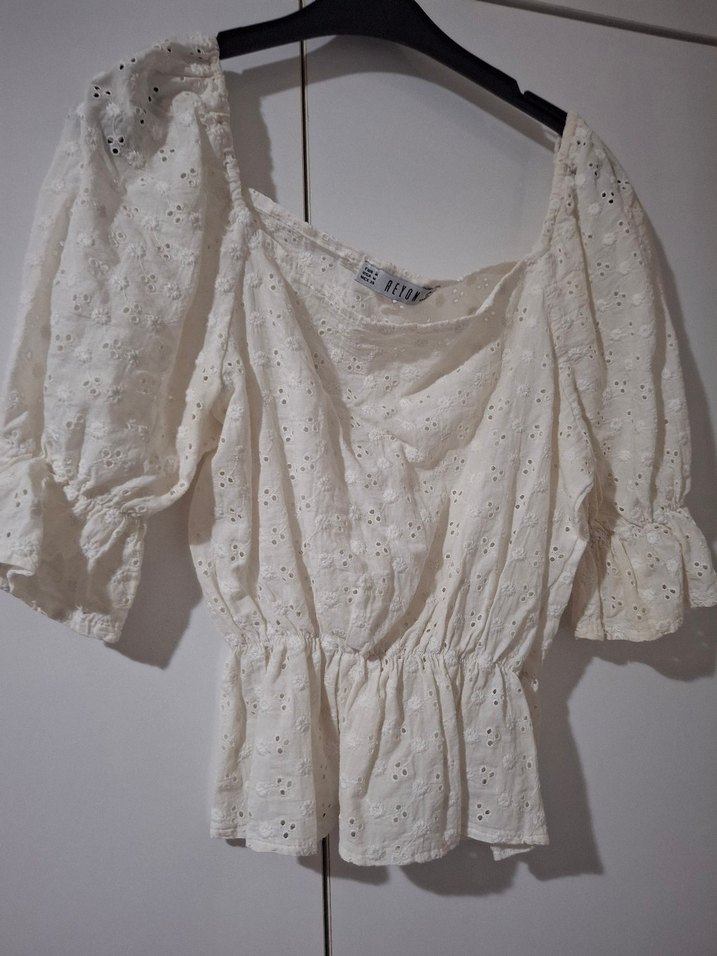 Dantel işlemeli, kısa kollu, V yaka beyaz mini bluz. Pamuklu, bol kesim ve bohem tarzında.