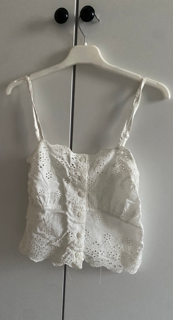 Beyaz renkli, nakışlı dantel detaylara sahip, V yaka ve kolsuz mini bustier. Pamuk kumaştan yapılmış, bohem ve vintage tarzına uygun, vücuda oturan kesim.