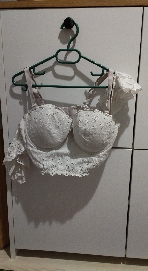 Pamuk kumaştan yapılmış, dantel detaylı, askılı kısa beyaz büstiyer. Vintage ve bohem tarzı ile günlük kullanıma uygun.