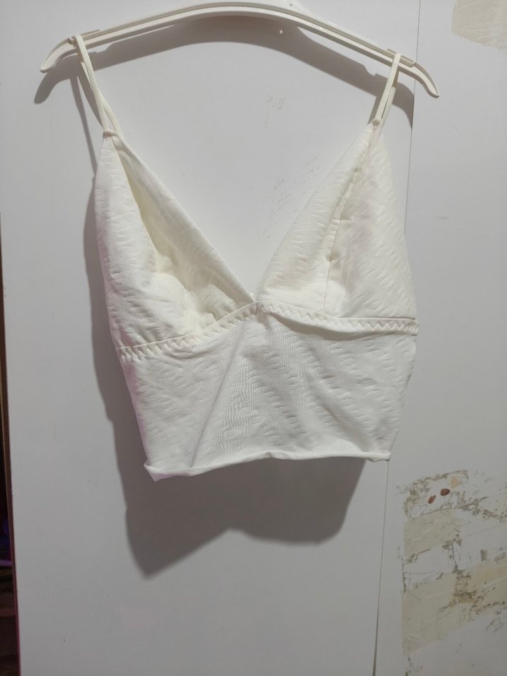 Dantel detaylı, V yakalı ve ince askılı beyaz mini büstiyer, yumuşak sentetik kumaştan üretilmiş, minimalist bohem tarz için uygun.