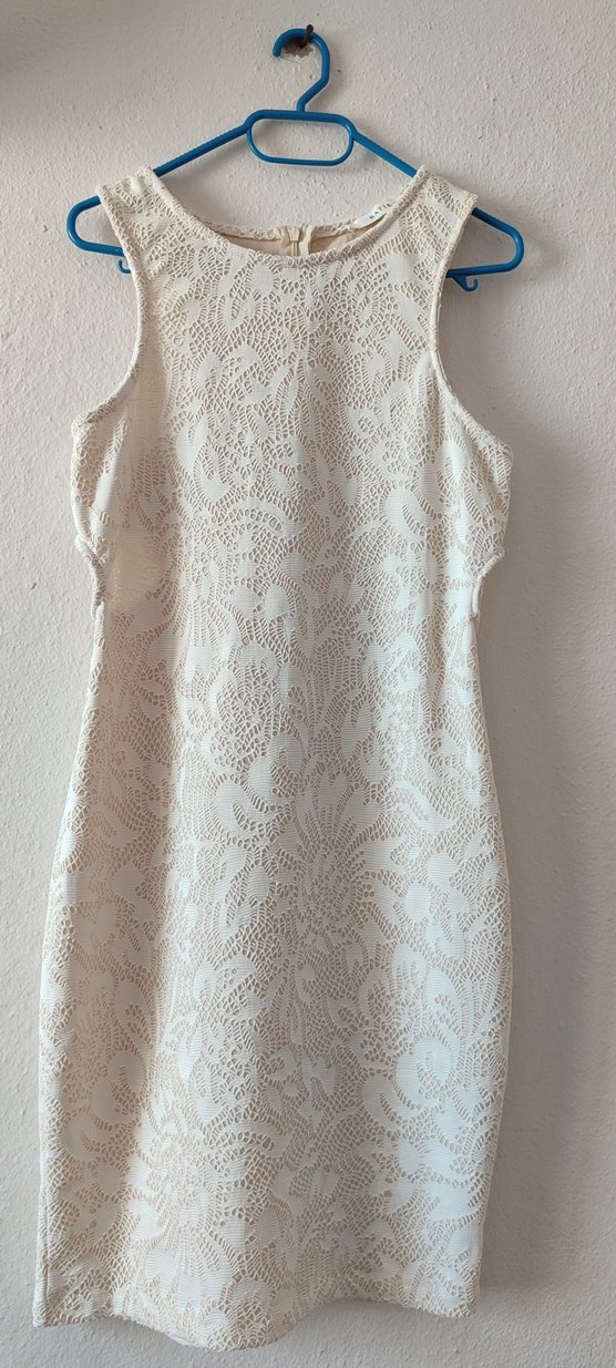 Dantel kumaştan, krem, bel dekolte detaylı elbise. Vücuda oturan kesimi ile günlük ya da davetler için uygun. (88cm toplam uzunluk)