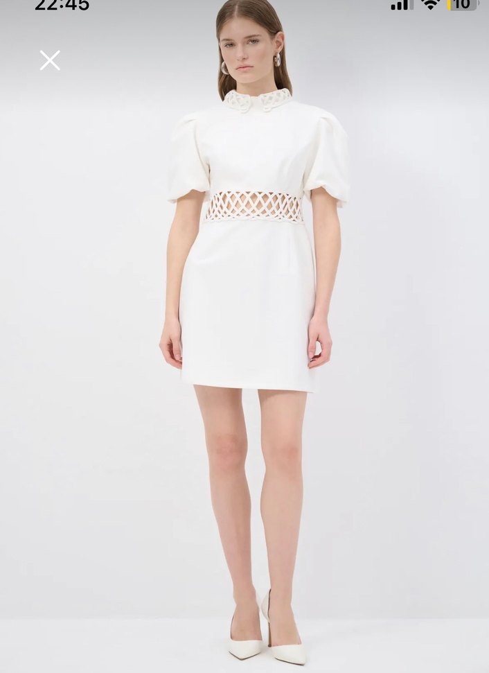 Beyaz mini elbise, kısa kollu, yüksek yakalı ve dantel detaylıdır. Nakışlı ve vücuda oturan modern klasik kesime sahiptir. Romantik akşamlar için uygundur.