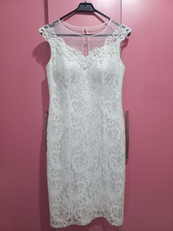 Dantel işlemeli beyaz mini elbise, V yakalı ve kolsuz, vücuda oturan kesime sahip. Düğünler için uygundur.