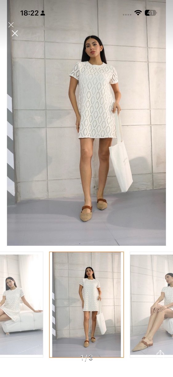 Dantel detaylı, V yakalı beyaz mini elbise. Yumuşak sentetik kumaştan, günlük kullanıma uygun rahat kesim.
