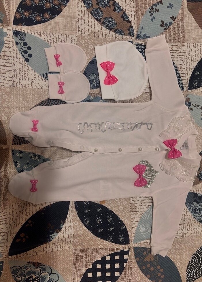 Beyaz renkte, uzun kollu, nakış ve dantel detaylı bebek kıyafet seti. Şapka ve eldivenlerde pembe fiyonklar bulunur. Yumuşak ve rahat kumaştan üretilmiştir. Hiç kullanılmadı unutmuşum yıkayıp kaldırmıştım 6 ay yazıyor ama 4 aylıkta giydirebilirsiniz alırken öyle demişlerdi ürün temizdir gönül rahatlığıyla alabilirsiniz üründe iade yoktur.