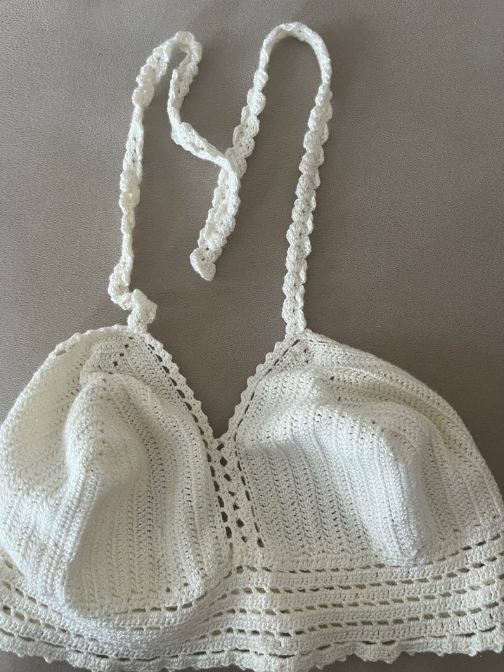 Dantel detaylı, V yakalı beyaz örgü büstiyer, ince askılı ve vücuda oturan bohem tarz sunar.