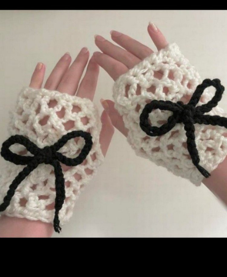 Beyaz örgü eldivenler, dantel desenli ve siyah fiyonk detaylı, rahat ve gotik tarzı bir araya getiriyor.