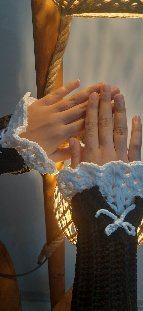 Dantel detaylı beyaz örgü eldivenler, gotik tarzda ve vintage dokunuşlu. Yumuşak ve zarif bir tasarıma sahiptir. marka temsili