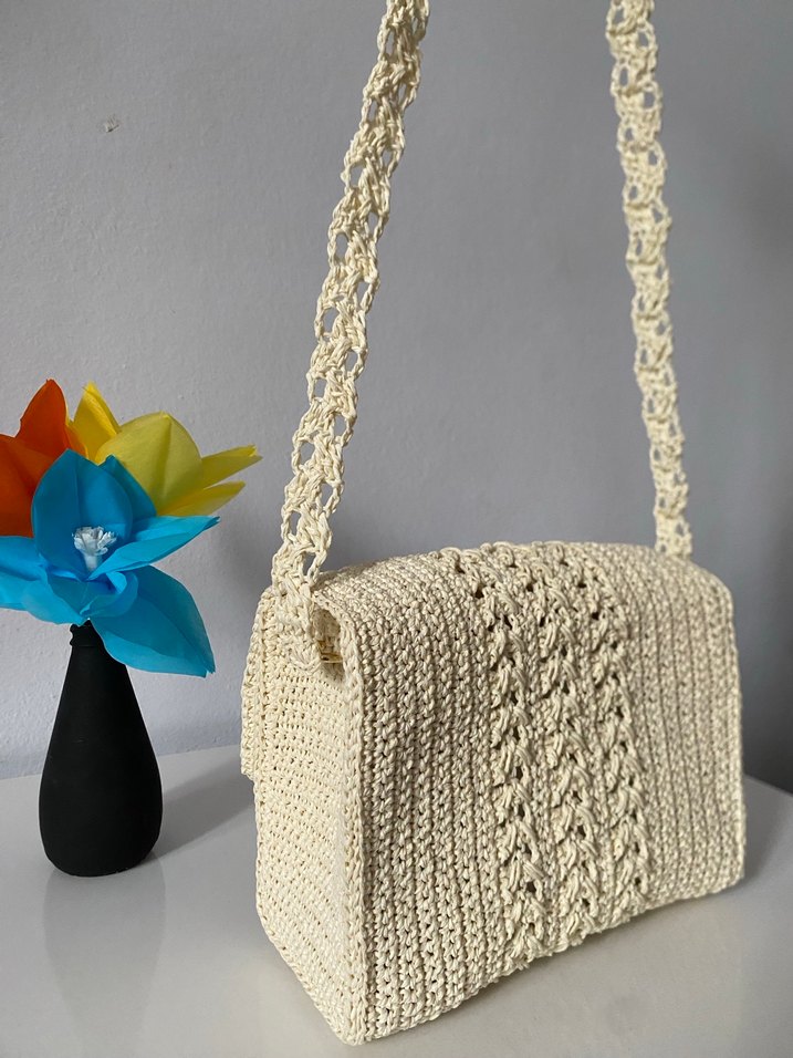 Beyaz örgü malzemeden yapılmış, dantel detaylı ve ince askılı çanta. Minimalist ve bohem tarzı yansıtır, günlük kullanıma uygundur.