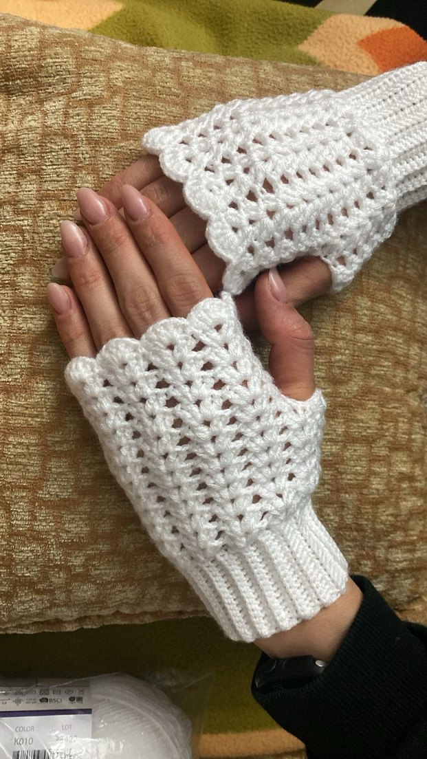 Dantel detaylı, beyaz renk örgü kadın eldiveni. Bohem tarzda, rahat ve parmakları açık tasarıma sahiptir.