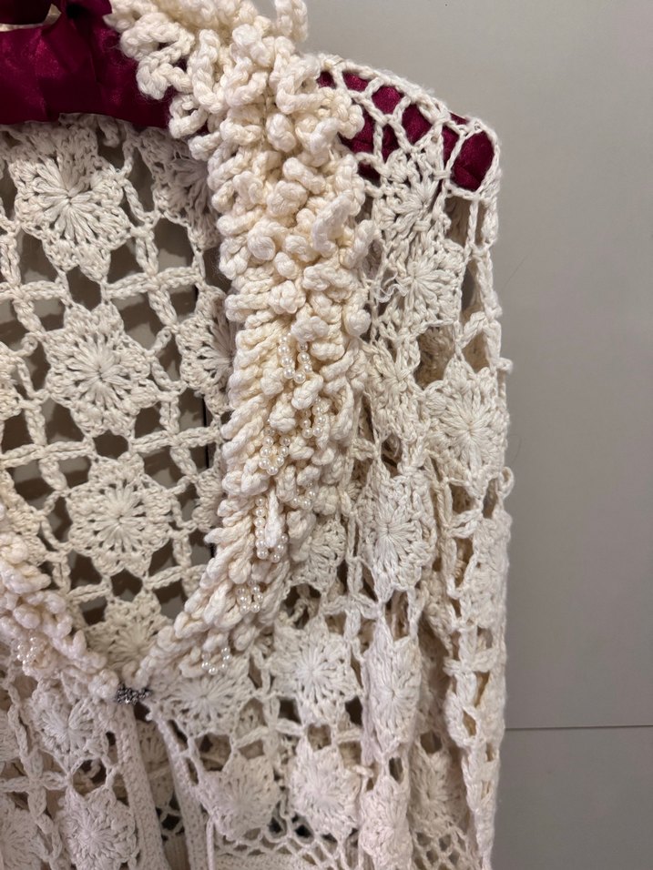 Dantel detaylı beyaz örgü kadın şal, bohem ve retro tarzını yansıtır. Hafif dokusu ile zarif bir görünüm sunar.