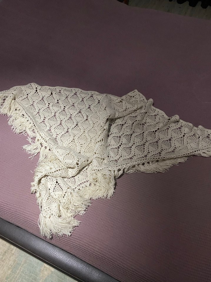 Yumuşak örgü kumaştan, dantel detaylı ve püsküllü kenarlarıyla bohem tarzda, hafif beyaz renkli kadın şalı.