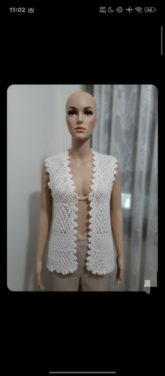 Beyaz renkli, dantel detaylı, V yakalı, kolsuz örgü kadın yelek. Kısa boyda, regular fit olup günlük kullanıma uygundur. Bohem tarzıyla öne çıkar. el yapımıdır
