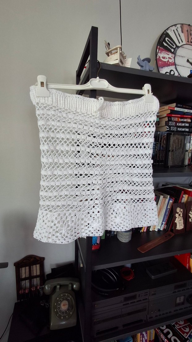 Beyaz örgü kumaştan, dantel detaylı plaj eteği. Mini boyda, bohem tarzda, günlük kullanıma uygun.