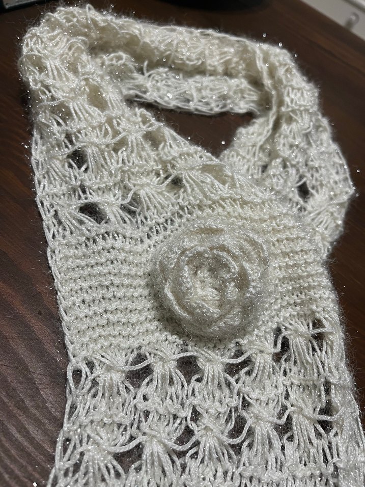 Dantel detaylı ve çiçek süslemeli beyaz örgü şal, rahat ve bohem bir tarz sunar. Retro hippie stiline uygun bir aksesuar.