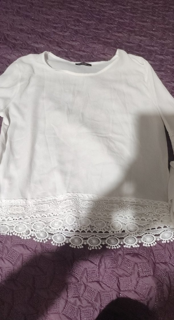Uzun kollu, yuvarlak yakalı beyaz pamuklu bluz, nakışlı desenler ve etek kısmında dantel detaylıdır. Salaş ve bohem tarzda.