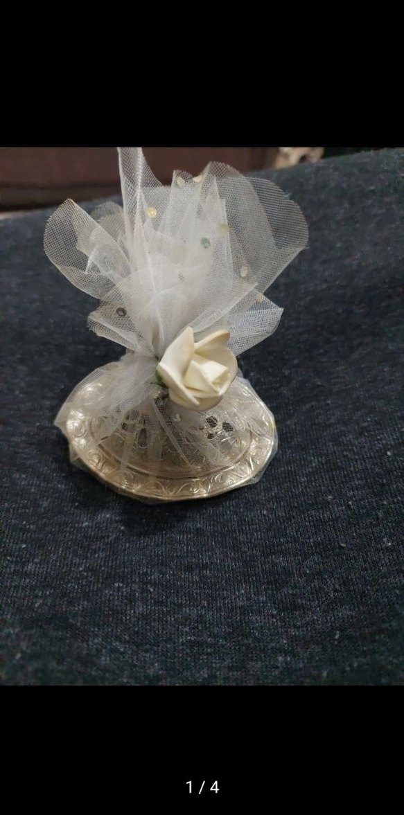 Beyaz renkli, dantel detaylı ve parlak yüzeye sahip düğün aksesuarı. İnce tül ve küçük bir kumaş güllerle süslenmiştir. lokumluk