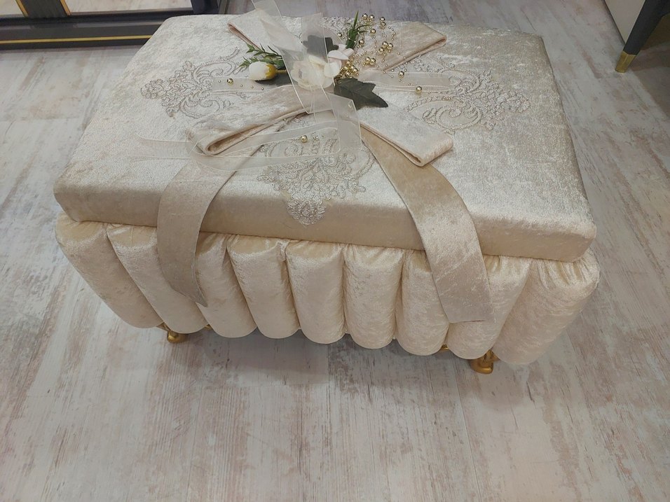 Beyaz parlak kumaş ve zarif dantel detaylarıyla süslenmiş, yumuşak kurdele ve çiçek dekoruyla vintage klasik şıklık sunan gelin sandığıdır.Tertemiz hiç kullanılmadı..ölçü:52×34. yukselik:36