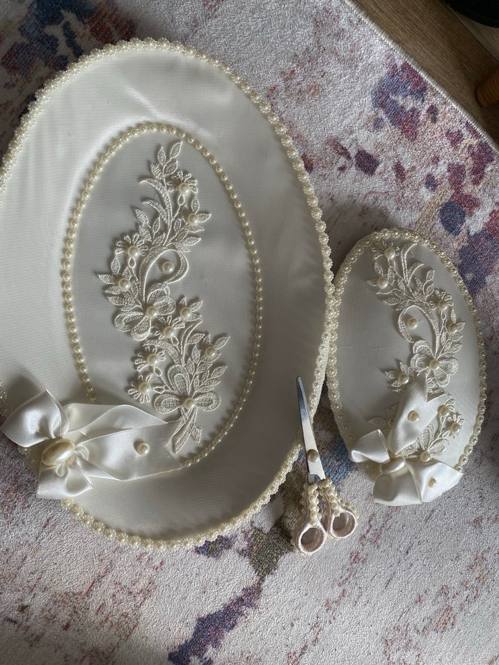 Dantel işleme ve inci süslemeli beyaz parlak düğün tepsileri, dekoratif saplı uyumlu bir makas seti ile tamamlanmıştır. Sadece 3.resimde belli makasta yapışması gereken bir kopukluk var.