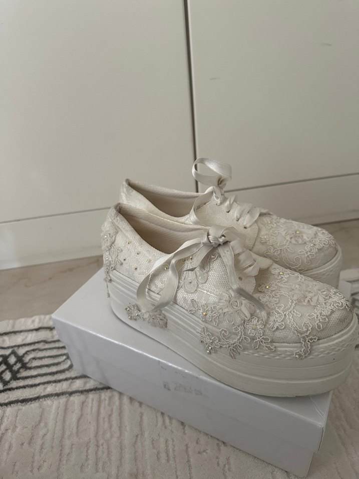 Beyaz kadın platform spor ayakkabılar, dantel nakış ve kurdele bağcıklarla süslenmiştir. Minimalist düğün stiline uygundur. Kauçuk taban rahatlık ve yükseklik sağlar. #gelin #gelinlik #gelinayakkabısı #dügün #wedding #shoes #ayakkabı #platformayakkabı