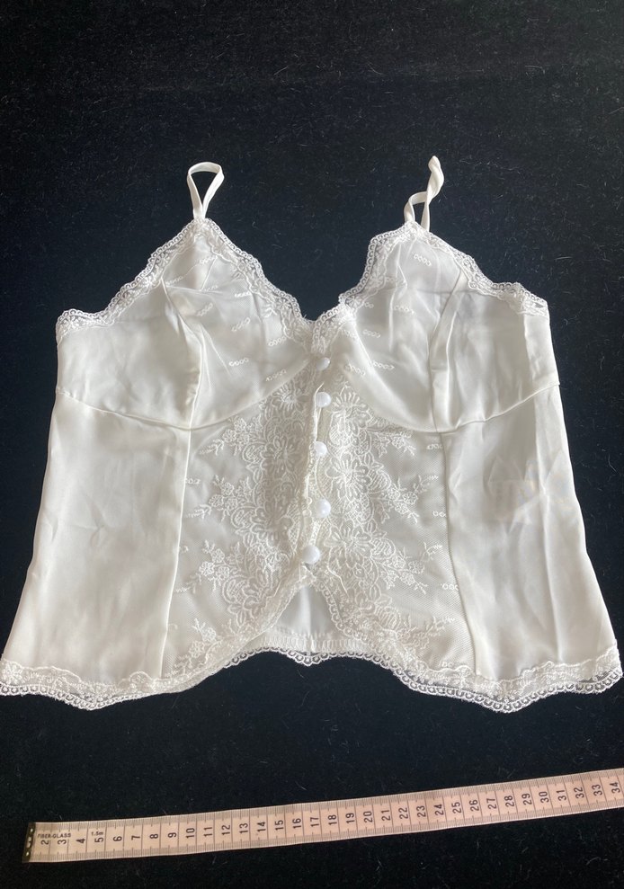 Saten kumaşlı, dantel ve işlemeli detaylara sahip beyaz, v yaka, kolsuz, vintage bohem tarzda, düğün için uygun, vücuda oturan büstiyer. ✨