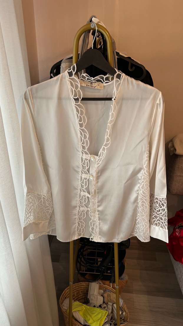 V yaka, uzun kollu ve dantel işlemeli beyaz saten pijama takımı altıda mevcut çeyizden hiç giyilmedi