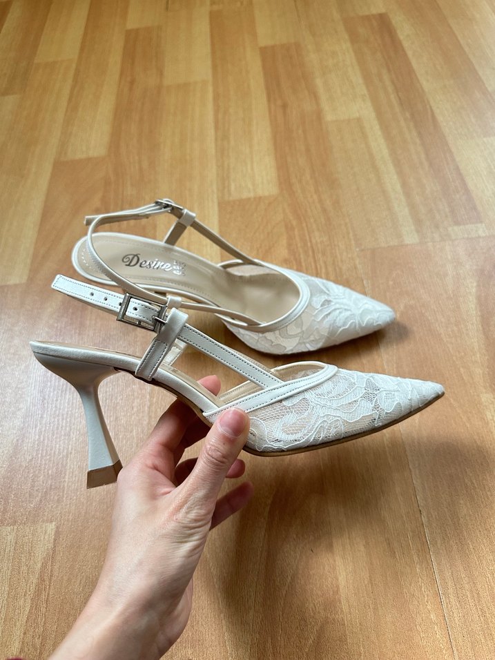 Dantel işlemeli beyaz stiletto topuklu ayakkabılar, modern klasik tasarıma sahip ve gelinlik için uygun. Kauçuk tabanlı ve ayarlanabilir kayışlıdır.