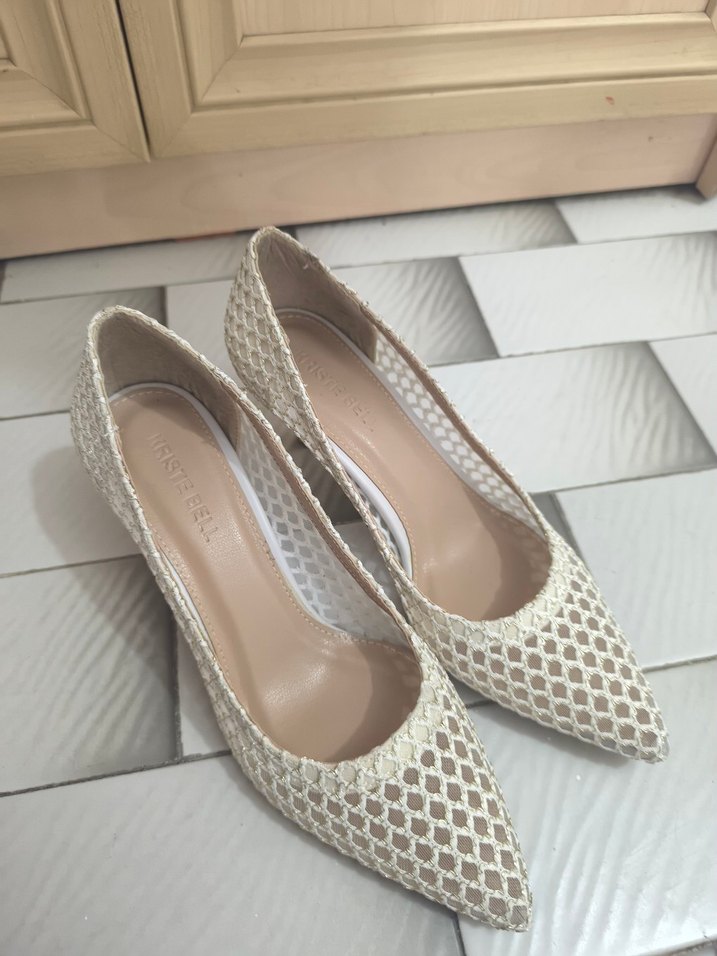 Dantel detaylı, hafif yılan derisi desenli beyaz stiletto topuklu ayakkabılar. Modern klasik tarzda, gelinlik için uygundur. Rahatlık için kauçuk taban kullanılmıştır.