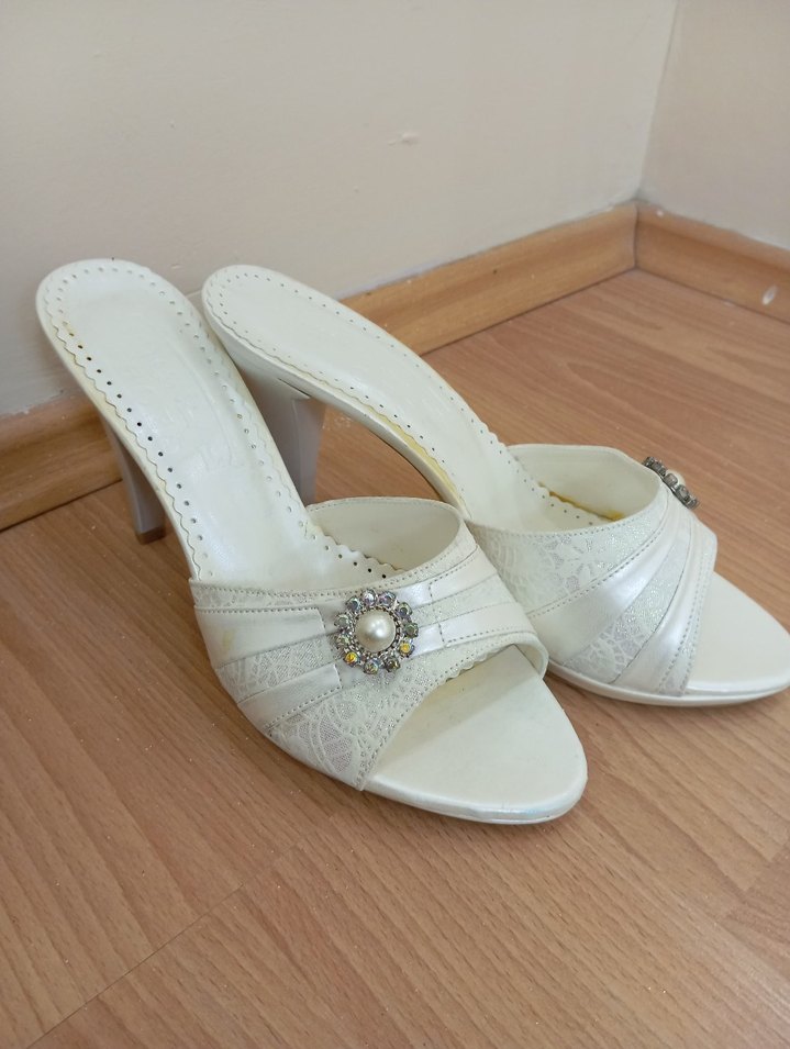 Dantel detaylı, parlak beyaz stiletto topuklu terlikler. Yılan derisi desenli ve önünde süslü broş bulunur. Klasik ve şık, düğünler için uygun.