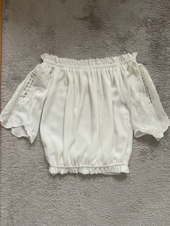 Kısa kollu, dantel ve nakış detaylı beyaz straplez mini bluz. Yumuşak kumaştan, bol kesim ve bohem tarzda. Günlük kullanıma uygun.