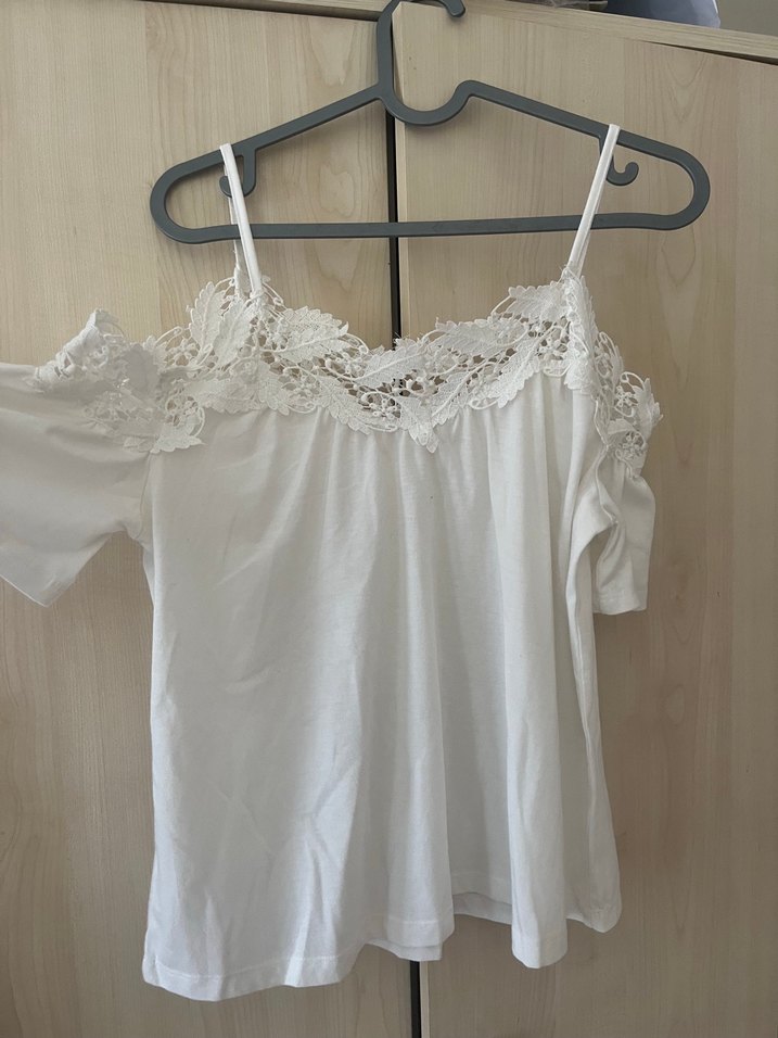 Dantel detaylı, straplez beyaz pamuklu bluz, kısa kollu ve bol kesim. Bohem tarz için uygun, günlük kullanıma ideal. Kot şortlarla çok güzel duruyor