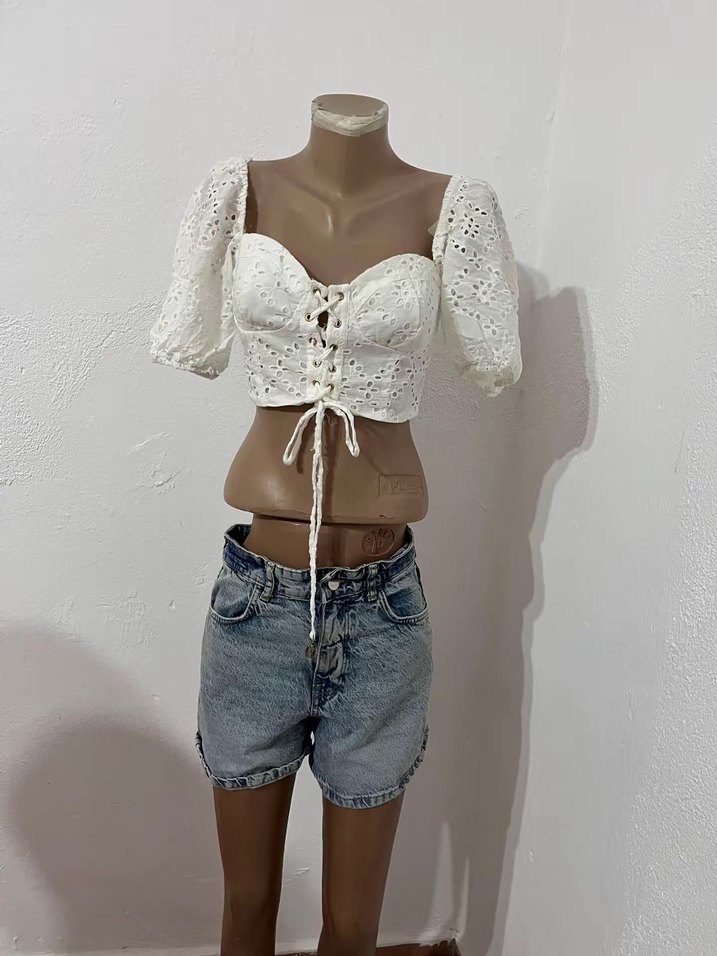 Dantel işlemeli, straplez ve kısa kollu beyaz bluz, rahat kesimiyle günlük sokak stiline uygundur. Üst neden m / quzu Alt beden 36/ zara ( ikili)
