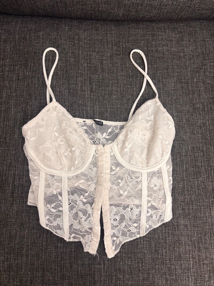 İnce askılı, dantel detaylı beyaz bustiyer. Vintage gotik tarzda, yumuşak sentetik kumaştan, günlük kullanıma uygun. ✨