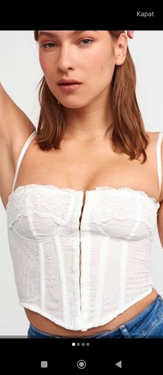 Yumuşak pamuktan üretilmiş, dantel detaylı ve askılı beyaz bustiyer. Straplez yakalı ve midi uzunlukta, romantik akşamlar için uygun.