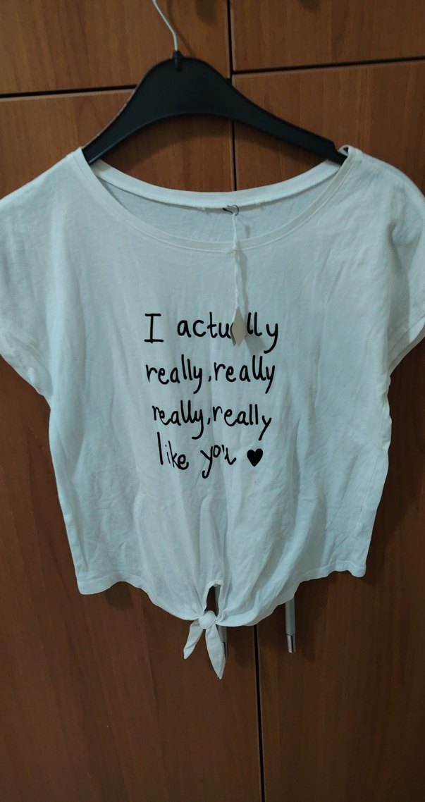 Beyaz kız çocuk tişörtü, kısa kollu ve yuvarlak yaka. Ön kısmında bağcık ve baskı yazı ile dantel detayı bulunur. Pamuklu ve rahat kumaşlıdır.