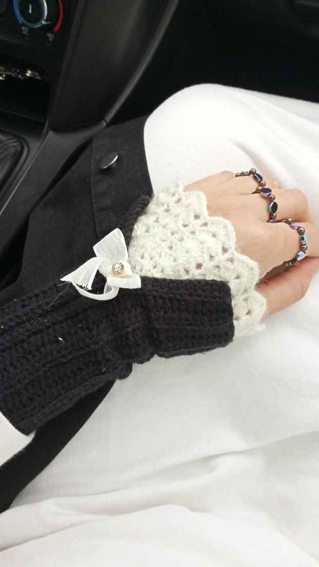 Dantel uçlu ve küçük fiyonk detaylı beyaz triko eldiven, rahat ve trend goth stilini bir araya getirir.