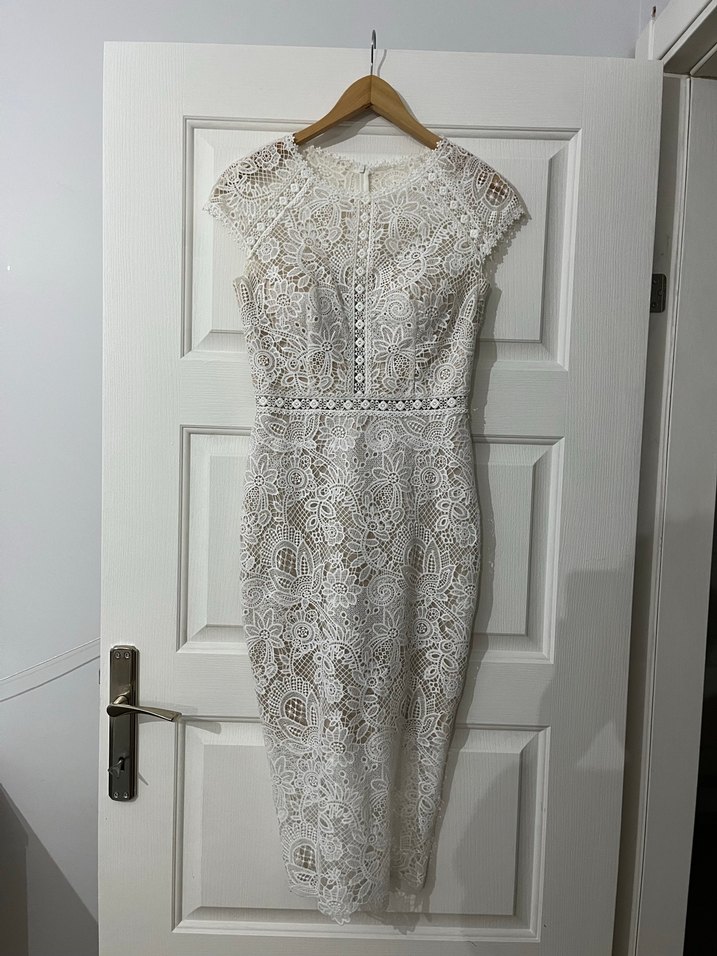 Dantel işlemeli, v yaka ve kolsuz beyaz uzun abiye elbise, klasik Paris tarzını yansıtır. Düğün için uygun, şık ve zarif bir model. Etiketinde 38 yazıyor ama 36 bedeni uygun daraltma işlemi yapıldı
