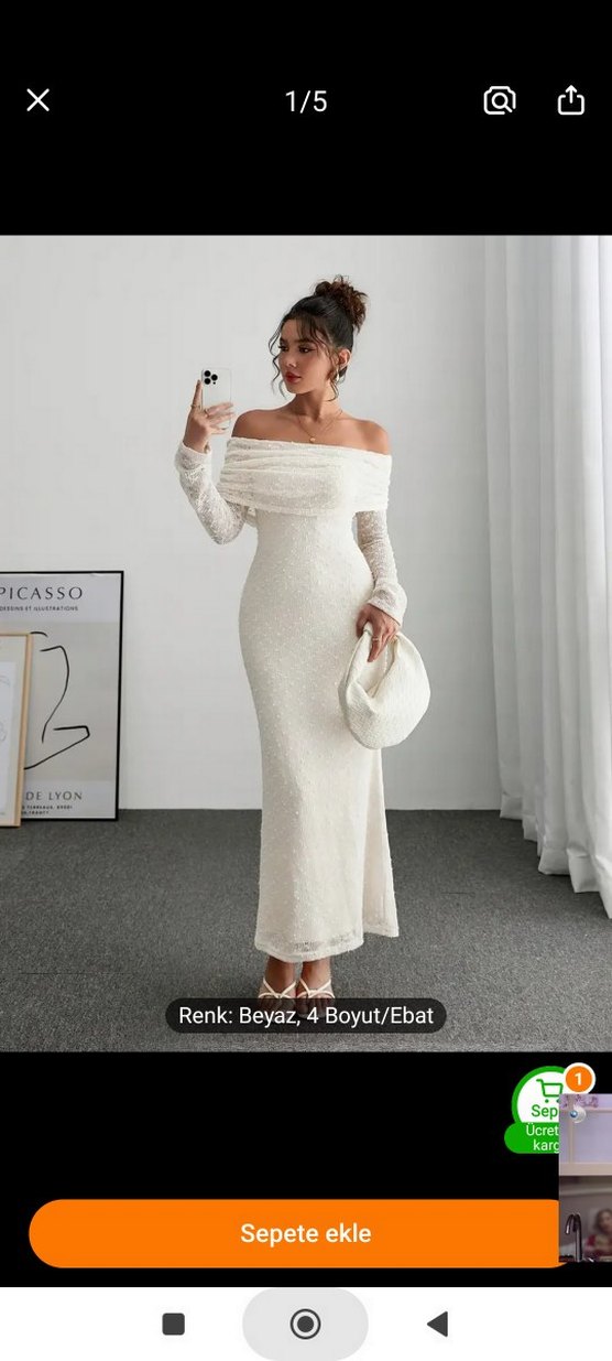 Uzun kollu, kayık yaka, dantel detaylı beyaz abiye elbise, klasik ve modern şıklığı bir arada sunar.