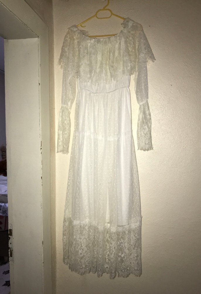Yumuşak keten kumaştan, dantel detaylı ve bol kesimli beyaz uzun bohem elbise. Askılı ve straplez yaka, düğünler için uygun.