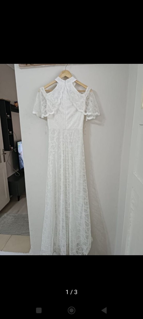 Dantel detaylı, işlemeli desenlere sahip beyaz uzun elbise. Straplez yaka ve askılı kollarıyla bohem tarzda, bol kesim. Sadece nikahta giydim kullanmadığım için satıyorum