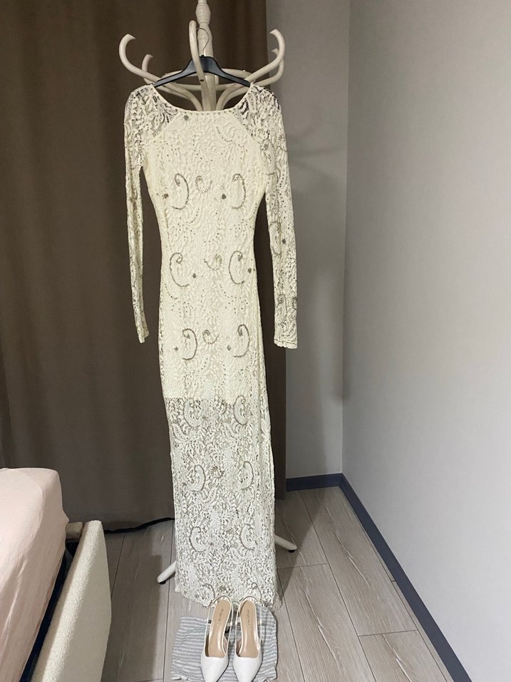 Dantel işlemeli, tekne yaka ve dar kesim beyaz uzun elbise, vintage bohem tarzıyla düğünler için uygun. Elbise dantel olarak alındı ama terzide tek tek boncuk işleme yapıldı.Bel kısmı tam oturacak şekilde