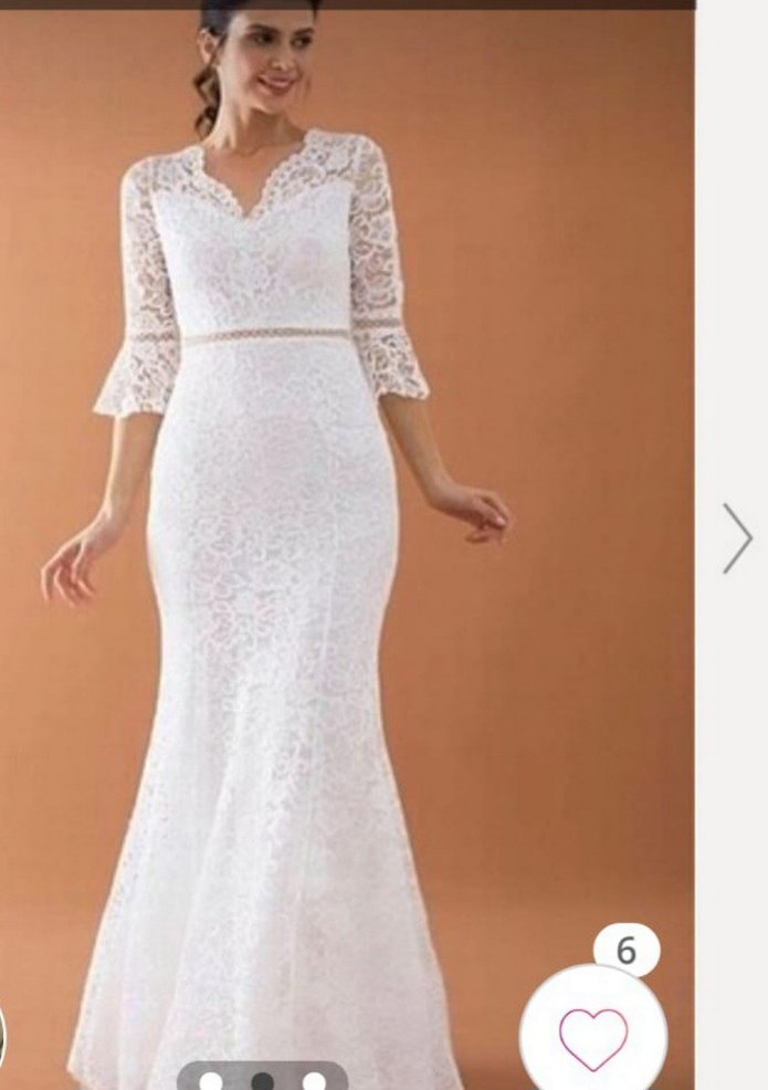 Dantel kumaştan, V yakalı ve uzun kollu beyaz gelinlik. Modern klasik tarzda, vücuda oturan kesimiyle zarif bir görünüm sunar.