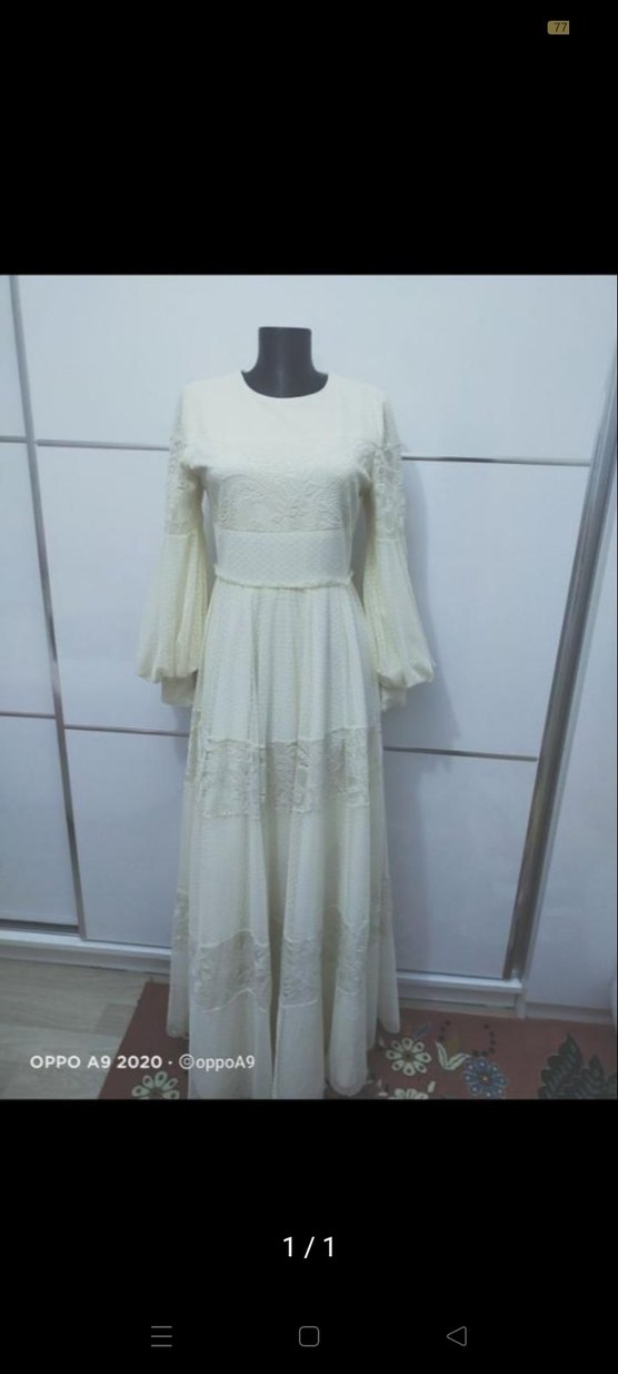 Dantel detaylı, uzun kollu beyaz vintage tarzı elbise. Pamuk kumaştan, yuvarlak yakalı, düğünler için uygun rahat kesim.