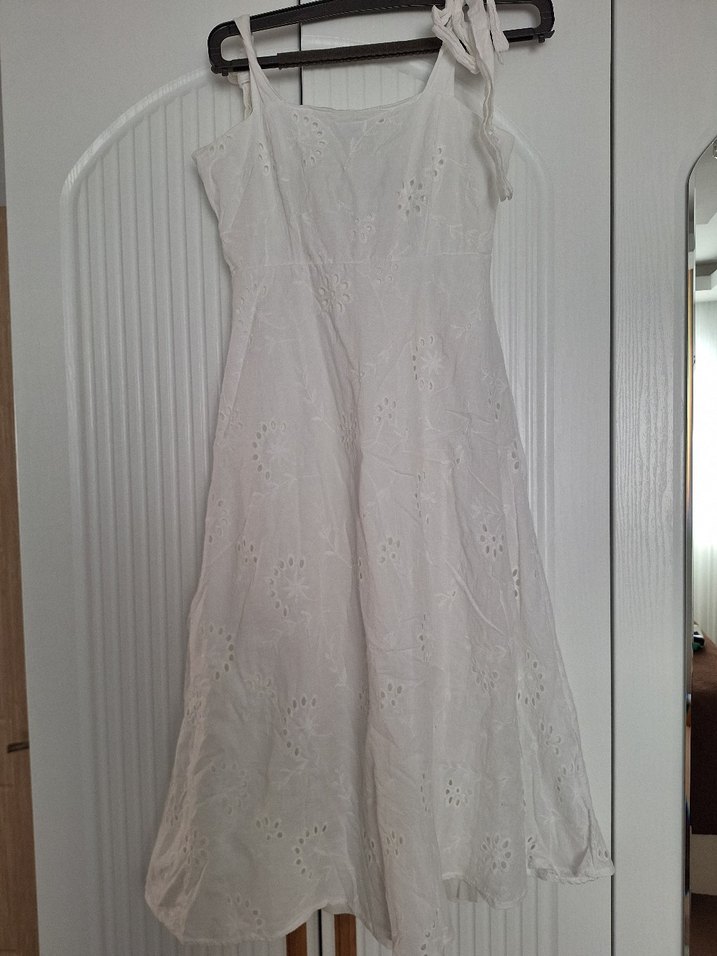 Dantel detaylı, askısız uzun beyaz keten elbise, bol kesim ve straplez yakaya sahiptir. Bohem tarzda düğünler için uygundur. 1 kere giyildi